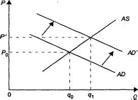 Если в стране имеются дополнительные мощности и незанятая рабочая сила, то кривая предложения имеет положительный наклон. В этом случае рост цен (Р' – Р0) сопровождается и ростом выпуска (q1-qо) (рисунок 4).