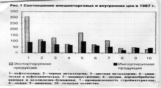 Такая ситуация могла существовать прежде всего благодаря тому, что внешняя торговля была жестко централизована. Причем решения в очень небольшой степени учитывали экономическую эффективность, измеренную в действующих ценах: в расчетах с производителями применялся спектр специальных обменных курсов, дифференцированных по отраслям и по группам продукции. В итоге Советский Союз имел сравнительно низкую интегрированность в мировую экономику. Экспорт и импорт охватывали довольно узкий и неизменный круг продукции (поставки преимущественно нефти, газа, леса, военной техники и закупки зерна, оборудования, товаров легкой промышленности). [14, с. 9-10]