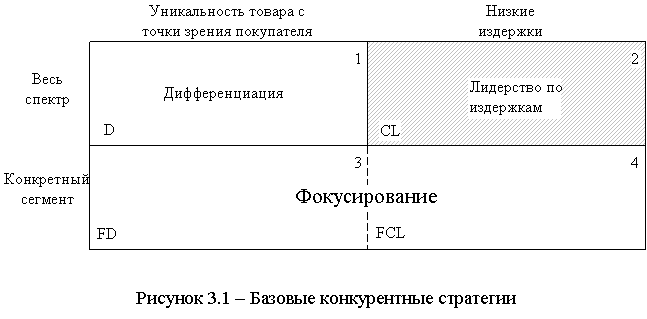 Согласно диаграмме Портера по выбору основной стратегии (она представлена на рисунке 3.1, [25, с. 20]), предприятие может выдерживать конкуренцию либо поддерживая низкие затраты, либо предлагаю превосходящую конкурентов продукцию. В основе концепции базовой конкурентной стратегии лежит идея о том, что каждая из таких стратегий базируется на определенном конкурентном преимуществе. Для того, чтобы добиться такого преимущества, предприятию необходимо выбрать свою конкурентную стратегию. В реальном бизнесе практикуют следующие три базовые конкурентные стратегии: