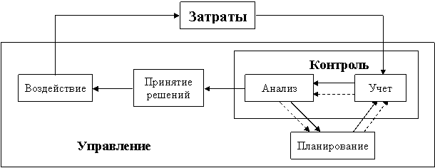 Как мы уже отмечали, управление – это целенаправленное воздействие. Основа же качественного управления заключается в определении объекта, направления и способов такого воздействия. Управление затратами должно включать следующие процедуры: планирование, учет затрат, анализ учетной информации, принятие решений на основе результатов анализа и осуществление необходимых воздействий на затраты с целью их оптимизации.