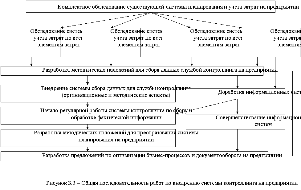 Главной задачей отдела контроллинга на этом этапе является запуск сбора контроллинговой информации (иными словами – информации максимально пригодной для эффективного контроля затрат предприятия). Общая последовательность работ по внедрению контроллинговой системы управления затратами на предприятии показана на рисунке 3.3 [15, с. 161]. Безусловно конкретная ситуация может потребовать включения каких-либо
