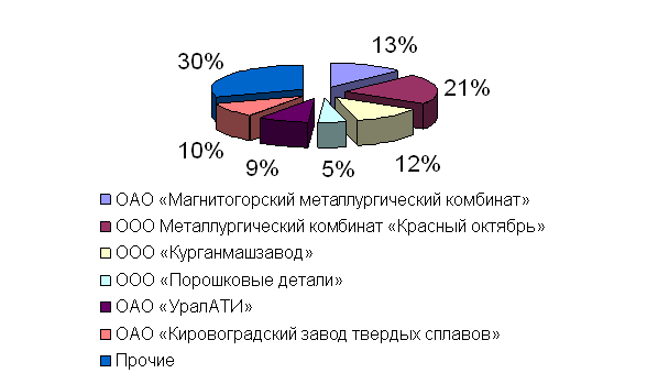 Поставщиками сырья и материалов являются около 110 фирм России, из них основными можно считать: ОАО «Магнитогорский металлургический комбинат» г. Магнитогорск, ООО Металлургический комбинат «Красный октябрь» г. Волгоград, ООО «Курганмашзавод» г. Курган, ООО «Порошковые детали» г. Москва, ОАО «УралАТИ» г. Асбест, ОАО «Кировоградский завод твердых сплавов» г. Кировоград (Рис 1.2).