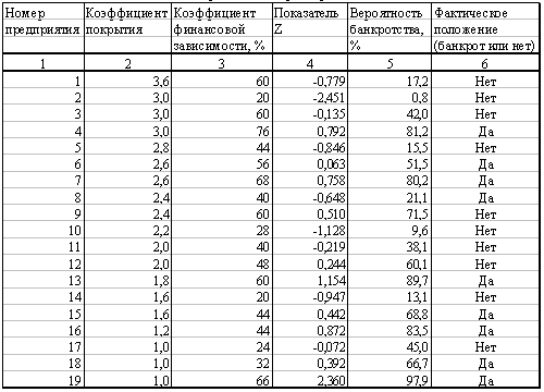 Решение данной модели лучше представить в виде таблицы 4.1. В таблице приведены исходные данные (столбцы 1, 2, 3, 6) и результаты расчетов показателя Z и вероятности банкротства (столбцы 4, 5).