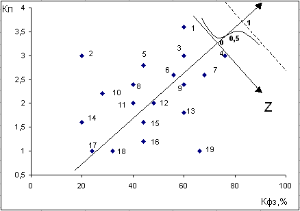 Рисунок 4.1 - Дискриминантная линия на корреляционном поле показателей Кп и Кфз