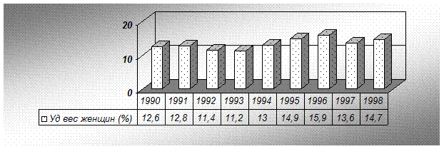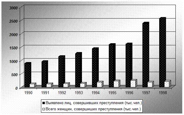 Анализ криминогенной обстановки общества позволяет определить его качественное состояние. Сопоставление статистических данных о преступности представителей мужского и женского пола позволит выявить их различия. Прежде всего, следует отметить, что женщины традиционно отличаются значительно более низкой криминальной активностью, по сравнению с мужчинами. Удельный вес женщин в структуре преступников невысок и на протяжении последнего десятилетия этот показатель претерпевает незначительные колебания, не превышая, при этом традиционный 11-15%-ный уровень. Однако абсолютные статистические показатели свидетельствуют о наличии тенденции роста женской преступности. Так, за последние пять лет (с 1990г. по 1998г.) число женщин, вовлеченных в криминальные формы поведения, выросла в 1,8 раза[ii]. При этом следует отметить, что криминализация женской половины населения России идет весьма интенсивно, и темпы прироста числа выявленных женщин-преступниц опережают соответствующий показатель мужской преступности. Так, за истекшее время с1993 по 1998гг число женщин, совершивших преступление, выросло в 1,5 раза, а количество мужчин-преступников, за аналогичный период времени, увеличилось лишь в 1,1 раза.