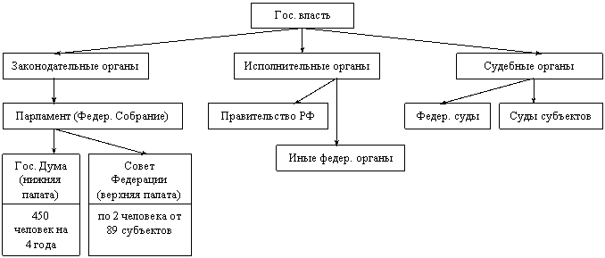 Гос власть в РФ подразделяется на органы законодательной, исполнительной и судебной ветвей власти. При этом 1 ветвь гос. власти ограничивается другой; различные ее ветви взаимно уравновешивают друг друга, предотвращая монополизация власти каким-либо одним органом.