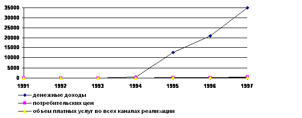 Цены на платные услуги растут опережающими темпами по сравнению с денежными доходами и потреблением платных услуг. В действующих ценах доходы населения увеличились по сравнению с 1996 г. на 28%, при этом цены на потребительские товары увеличились на 12,5%, а платные услуги – на 40,4%, а объем платных услуг увеличился всего лишь на 2,0%.