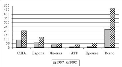 В 1998 г. объем рынка продуктов ИТ в мире достиг 758 млрд. долл., что на 6,7% больше, чем в 1997. Ожидается, что в период до 2003 г. темпы роста этого рынка составят около 9,5% в среднем за год, и уже в 2002 г. его объем превысит 1 триллион долларов США. В 1999 г. даже такие региональные рынки, как Восточная Европа и Азиатско-Тихоокеанский регион, в наибольшей степени пострадавшие от финансового кризиса, восстановили рост расходов на ИТ (+2% в Восточной Европе и +8 в АТР после падения, соответственно на: -6% и -9%). Около половины этого рынка составляют информационные услуги (Рис. 6).