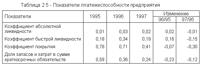 Внешним проявлением финансовой устойчивости выступает платежеспособность предприятия. Результаты анализа платежеспособности ОАО "Белореченское ХПП" в 1995 - 1997 гг. представлены в таблице 2.5.