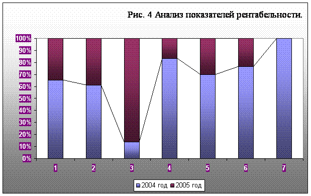 Анализ показателей рентабельности выявил негативные тенденции в развитии предприятия, так как за 2005 год произошло снижение рентабельности по всем активам и видам деятельности предприятия. Рентабельность основной деятельности и рентабельность продаж по сравнению с 2004 годом снизились по причине уменьшения прибыли от продаж. Рентабельность внеоборотного капитала уменьшилась на 0,041 в результате снижения чистой прибыли и увеличением вложений во внеоборотные активы. Рентабельность оборотного капитала снизилась на 0,16 по причине отсутствия возможности у предприятия обеспечить достаточный объем прибыли по отношению к используемым оборотным средствам компании. Результатом снижения рентабельности совокупных активов на 0,04 и рентабельности акционерного капитала также является снижение чистой прибыли за отчётный период. Негативной тенденцией является снижение рентабельности собственного капитала, что свидетельствует о понижении эффективности использования организацией ее собственного капитала.