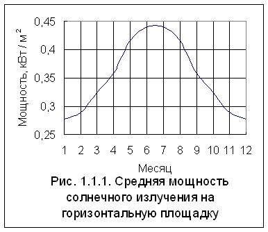 Солнечное излучение зависит от времени суток и года, и прозрачности атмосферы, поэтому для ориентации солнечного коллектора необходимо иметь соответствующие среднестатистические данные. В таблице 1.1.1. приведены данные о статистическом распределении плотности солнечного излучения, которые могут быть использованы для определения положения коллектора.