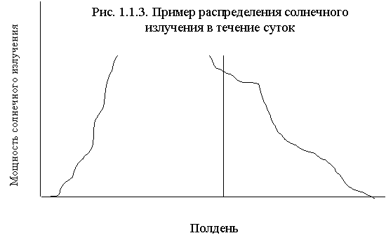 На рис.1.1.3. приведен пример плотности мощности солнечного излучения, реально падающего на солнечный коллектор. Здесь предполагается , что в утренние часы нет облачности , а в послеобеденные часы появляется облачность. Если такие условия являются статистически устойчивыми, то очевидно , что целесообразно ориентировать солнечный коллектор не строго на юг, а на юго-восток, причем более точное его положение должно определяться специальными оптимизационными расчетами .