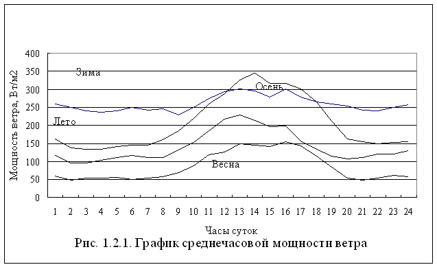 Из таблицы 1.2.1. видно, что наиболее вероятные скорости ветра равны 4 - 12 м/с. По данным таблицы 1.2.1. определена мощность ветра через единичную площадку Fо=1м, т.е. удельная мощность ветра, и построены графики (рис.1.2.1.).Удельная мощность, при этом, определялась с учетом вероятностного характера скорости ветра по формуле / 18,43/: