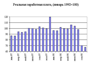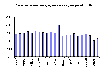 Так, по статистическим данным (Экономической экспертной группы при Департаменте макроэкономической политики МФ РФ), приведенным в Диаграмме 1, в сентябре реальная заработная плата уменьшилась (по сравнению с июлем) более чем в три раза. Правда, в октябре наблюдалось частичное восстановление реальных доходов населения после их обвала на 23% в сентябре. Среднедушевой денежный доход повысился с 973 руб. в сентябре до 1093 руб. в октябре (т.е. на 12,4%). Таким образом, рост доходов опережал темпы инфляции, что обеспечило рост реальных располагаемых доходов на 7,4% по сравнению с уровнем сентября. Тем не менее, сохраняется значительное отставание реальных располагаемых доходов от соответствующего периода прошлого года. Такое отставание составило 26,9% для октября и 14,0% в целом за десять месяцев.