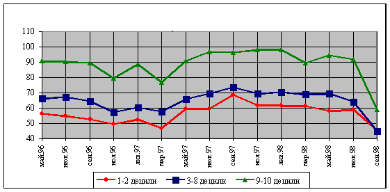 Рисунок.1. Индекс потребительских настроений по доходным группам респондентов в 1996- 1998 гг.