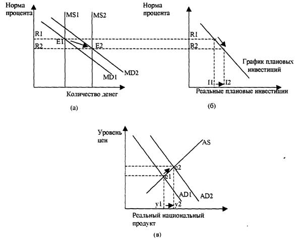 Поскольку банки, стремясь привести в движение свои дополнительные резервы, вступают в конкурентную борьбу, норма процента падает. Падающая норма процента уменьшает альтернативную стоимость инвестиций. Фирмы реагитруют на это, перемещаясь вправо, вниз вдоль графика плановых инвестиций в части (б) рисунка. Из за этих изменений происходит рост совокупных доходов. Прирост объема реальных плановых инвестиций в свою очередь, заставляет сдвинуться вправо кривую совокупного спроса, как это показано в части (в).