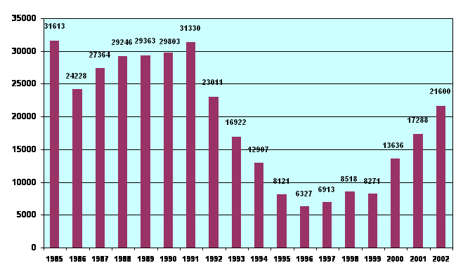 Производство пива в Республике Казахстан за 1985-2002 гг, тыс. дал