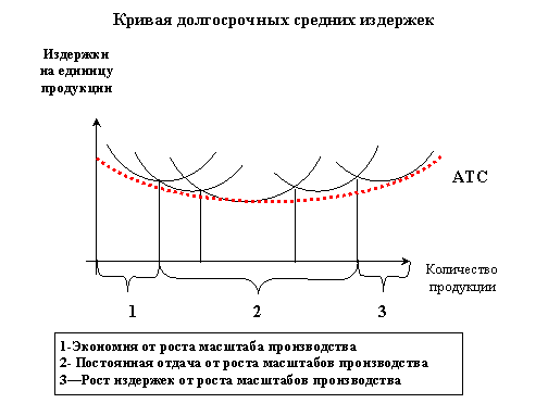 В долгосрочном периоде все издержки производства будут переменными. Анализ изменения долгосрочных издержек важен для выбора стратегии развития предприятия в области масштабов своей деятельности. Кривая долгосрочных средних общих издержек (ATC) ( рис.3.1.3.) показывает наименьшие издержки производства единицы продукции с которыми может быть обеспечен любой объем производства при условии ,что предприятие имело в своем распоряжении достаточно времени чтобы для проведения всех необходимых изменений в размерах предприятия. Кривая долгосрочных издержек состоит из участков кривых краткосрочных издержек применительно к масштабам производства, между которыми предприятие могло бы делать свой выбор. Данное положение объясняется положительным и отрицательным эффектом масштаба.
