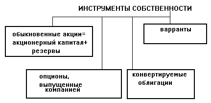 Итак, инструменты собственности - это представленная в форме простых акций собственность владельцев компании. Однако понятие акционерного капитала распространяется и на те ценные бумаги, которые можно конвертировать в акции в будущем(опционы, варранты и конвертируемые облигации).