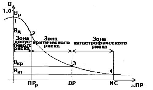 Третья точка (∆ПР=ВР и В=Вкр) соответствует величине потерь, равных расчетной выручке ВР. Вероятность таких потерь равна Вкр.