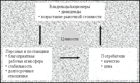 Процветающее предприятие - это предприятие, получающее устойчивую прибыль от своей деятельности. Эта задача-максимум может быть реализована на стабильной основе только через осознание и наиболее полное удовлетворение общественных потребностей или, согласно получившей широкое распространение в международной теории и практике бизнеса концепций, через создание системы ценностей для трех общественных групп: владельцев (акционеров) предприятия, потребителей его продукции, поставщиков и персонала предприятия. Владельцы (акционеры) предприятия, заинтересованы в постоянном и все более возрастающем потоке доходов и таком использовании собственных и привлеченных средств, которое увеличивает ценность принадлежащей им собственности. Персонал и поставщики заинтересованы в стабильности предприятия, в развитии с ним долгосрочных отношений, в благоприятной рабочей атмосфере. Для потребителей наивысшую ценность представляют товары и услуги, удовлетворяющие их по качеству и цене (рис.1).