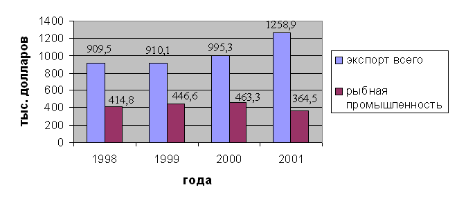 Таким образом, в целом инвестиционный климат Приморского края благоприятен, а, говоря о рыбной промышленности Приморского края, следует отметить, что она является одной из немногих высокорентабельных во внешнеторговом отношении отраслей экономики, несмотря на некоторые деструктивные моменты. Последствия данных процессов хорошо видны на графике, они проявляются в резком снижении экспорта рыбопродукции в 2001 году на 98,8 тыс. долл. по сравнению с 2000 годом. Здесь свою роль сыграло как старение и списание рыболовных судов, так и сдача судов нерезидентам по бербоут-чартерным схемам.