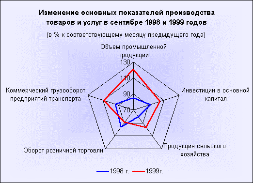 Ниже приводится диаграммы (радары), характеризующие изменения основных показателей производства товаров и услуг в сентябре и январе-сентябре 1998 и 1999гг. (в % к соответствующему месяцу предыдущего года):
