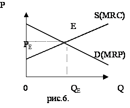 Если рынок готовой продукции также совершенно конкурентный, то кривая спроса D показывает предельную доходность ресурса MRP, которую потребители ресурса получат от его дополнительного использования. MRP, как отмечалось ранее, будет снижаться по мере увеличения количества единиц ресурса. Кривая же предложения ресурса отражает издержки фирмы, точнее, предельные расходы от использования дополнительной единицы ресурса MRC. Следовательно, в точке E предельная доходность ресурса MRP равна его предельным издержкам MRC.