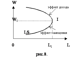 На рис.8. изображена кривая, показывающая общее количество рабочего времени, отработать которое при данной величине заработной платы согласна какая-либо категория (или группа) трудящихся. На нем видно, что одна и та же причина - увеличение заработной платы приводит и к росту и к сокращению предложения труда.