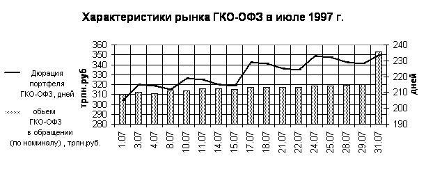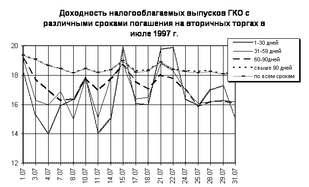 Снижение доходности рынка ГКО-ОФЗ до уровня 18 - 19% (причем доходность только ГКО в лучшие времена составляла в среднем 18%, а ОФЗ - 21%), (диаграмма 5.4.)исчезновение спекулятивного интереса участников рынка позволили говорить об успехах политики правительства. К тому же стабильно низкие темпы инфляции - менее 1% в месяц, невысокий рост валютных котировок, “бум” в секторе корпоративных акций вселили уверенность в выполнимости намеченных планов - уменьшении доходности гособлигаций к концу года до 13 - 15%. Но такая стабильная ситуация продлилась лишь до середины июля - с определенного момента ставка доходности рынка ГКО перестала быть привлекательной для западных инвесторов, а потому новые инвестиции на российский рынок не пришли.