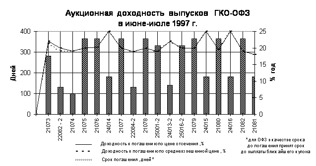 В целом июнь выдался, пожалуй, самым благоприятным для властей месяцем - рынок полностью контролировался ими. Так что, несмотря на огромные выплаты по погашаемым выпускам - порядка 37 трлн. руб., июньские аукционы не составили особых проблем для эмитента. А с 30 июня Центральный банк РФ даже разрешил всем дилерам на рынке ГКО-ОФЗ регистрировать внесистемные сделки между ними и их клиентами, что должно было упростить работу дилеров с клиентами. (Диаграммы 5.1., 5.2., 5.3.)