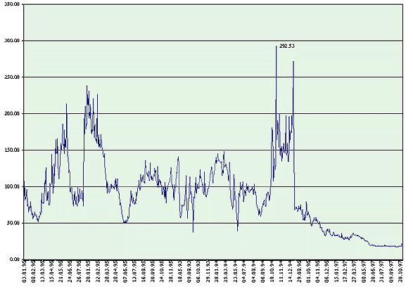Прогнозы специалистов по поводу дальнейшей судьбы этого сектора достаточно пессимистичны. Эксперты считают, что для первой половины будущего года будут характерны следующие уровни доходности - 28 - 32%. Поскольку в последнее время рынок очень сильно ориентируется на нерезидентов, то многие прогнозы делаются именно на основе информации о поведении иностранных участников операций. Но так как лимиты средств, предназначенных для вложения на российском рынке, у иностранных инвесторов пока не велики, а пока ситуация на юго-восточном рынке остается напряженной, они вряд ли увеличатся, то ожидать скорого появления нерезидентских средств не следует. Правда, по поводу сроков возможного улучшения обстановки мнения экспертов расходятся. Одни считают, что приход средств иностранцев следует ожидать не ранее 1998 будущего года. Другие же считают, что на усиление присутствия иностранных инвесторов можно будет рассчитывать уже весной. На диаграмме 5.5. показан график доходности рынка ГКО-ОФЗ в период с 1994 по 1997г.