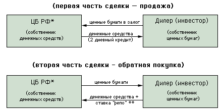 Объемы операций РЕПО в течение января были незначительными по сравнению с предыдущими месяцами, свидетельствуя скорее о нежелании участников рынка ГКО-ОФЗ привлекать ресурсы по высоким процентным ставкам в условиях неопределенности на финансовом рынке. Фактически привлечение средств через сделки РЕПО банки осуществляли для рефинансирования привлеченных ранее ресурсов. Действующая схема операций РЕПО приведена на рисунке 6.1.