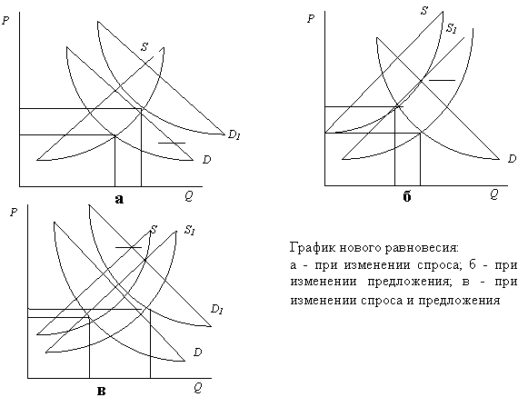 Колебания спроса и предложения изменяют равновесную цену и равновесие количества товаров на рынке.