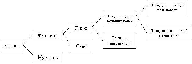 Суть метода группировок состоит в последовательной разбивке совокупности объектов на группы по наиболее значимым признакам. Какой-либо признак выделяется в качестве системообразующего критерия (владелец товара; потребитель, намеревающийся приобрести новый товар), затем формируются подгруппы, в которых значимость этого признака значительно выше, чем во всей совокупности потенциальных потребителей данного товара. Путем последовательных разбивок (на две или несколько частей) выборка делится на ряд подгрупп. На рис. 2.1. представлена схема последовательных разбивок по методу AJD (автоматический детектор взаимодействия), который получил в настоящее время широкое распространение.