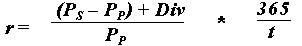 где t - число дней с момента покупки до продажи акции. (Если за прошедший период времени дивиденд на акцию не выплачивался, то он исключается из формулы).
