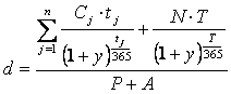 где d - дюрация, y - ставка доходности, P - текущая цена без учета накопленного купонного дохода, T - срок до погашения облигации,