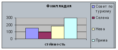 Финляндия. Самая посещаемая страна жителями Санкт –Петербурга. Поэтому почти все фирмы включают эту страну в свой ассортимент. Выбор туров очень различен. Есть туры на автобусе, па пароме. Соответственно разнообразны и цены на эти поездки. Чем крупнее фирма , тем больше разнообразных туров она может предложить (Таблица 7)
