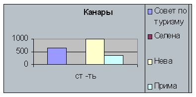 Как видно из таблицы “Селена” не занимается турами на Канары.никто не включил в стоимость туров визовой сбор. Компания “Прима” объявила стоимость тура, практически ничего не включив в него.