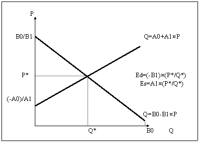 спрос: E(D)=-b1¤(p*/Q*) (2/2), где p*, Q* — равновесная цена и количество.