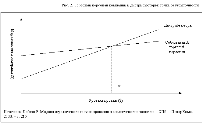 Выбор определенного типа маркетингового канала зависит от планируемых показателей продаж и прибыли компании, ресурсов, имеющихся в её распоряжении, и стратегии позиционирования. Если компания готова пожертвовать краткосрочной прибылью ради упрочнения и расширения рыночных позиций, возможно, целесообразно принять решение о расширении собственного торгового персонала (см. рис. 2), хотя прямые продажи сопряжены с высокими постоянными издержками. Напротив, реализация продукции через дистрибьюторов предполагает минимальные постоянные, но высокие переменные издержки. Если компания удовлетворена небольшой долей на рынке (ниже показателя «М» на рис. 2), то ей следует обратиться к услугам посредников.