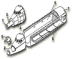 Боевой ударный модуль космического базирования: 1 - стыковочный узел; 2 - носовая часть фюзеляжа (НЧФ); 3 - переходный отсек; 4 - герметичный модуль кабины; 5 - носовой блок двигателей управления; 6 - средняя часть фюзеляжа (СЧФ); 7 - хвостовая часть фюзеляжа (ХЧФ); 8 - створки отсека полезного груза с панелями радиационного теплообменника