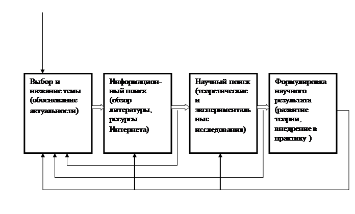 Процесс научных исследований, как организационная форма выполнения научно-исследовательской работы (НИР), определяется поставленной проблемой и может быть наглядно представлен моделью информационных взаимосвязей при выполнении этапов ВКР как особого вида НИР (Рис. 2)