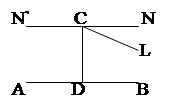 2) Если соединить (рис.2) какую-либо точку прямой DB с т. С, получим прямую, допустим, СК, проходящую через т. С и встречающую АВ. Итак, все прямые, проходящие через т. С внутри прямого угла NCD, разбиваются на две категории, на два класса: встречающие прямую АВ (названные Лобачевским «сходящимися» с АВ) и не встречающие прямую АВ (их Лобачевский называет «расходящимися» с АВ). Любая прямая первой категории образует с перпендикуляром CD угол, меньший угла, образованного перпендикуляром CD с любой прямой второй категории. Вращаясь непрерывно около т. С в направлении против часовой стрелки, прямая СК на известном этапе, допустим в положении CL, перестанет пересекать АВ и из сходящейся перейдет в категорию расходящихся с АВ прямых. Эта предельная прямая CL, служащая переходной прямой, граничной, отделяющей сходящиеся от расходящихся прямых, и названной Лобачевским параллельной к прямой АВ из т. С. Итак, параллельная CL – это не просто расходящаяся прямая, а первая, граничная расходящаяся, т.е. такая, что любая прямая, проходящая через т. С внутри угла, образованного параллельной CL и перпендикуляром CD, является сходящейся прямой, а всякая прямая, проходящая внутри угла LCN будет расходящаяся с прямой АВ. Угол DCL, образованный параллельной CL с перпендикуляром CD, называют углом параллельности.