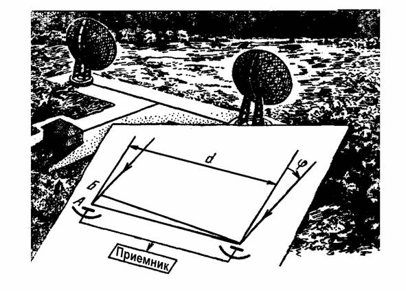 рис.3 Схема радиоинтерферометра (d- его база, т.е. расстояние между радиотелескопами, j характеризует направление на источник радиоволн).