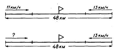 План решения той и другой задачи ученики могут составить сами. Решение лучше записать отдельными действиями. Затруднение обычно вызывает один из способов решения последней задачи (48:2=24, 24-13= 11). В этом случае, обращаясь к иллюстрации, надо показать, что в каждый час велосипедисты сближались на одинаковое расстояние, поэтому легко узнать, на сколько километров они сближались в час, выполнив деление (48:2=24), зная это и скорость одного из них, можно найти скорость другого (24—13=11).
