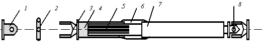 1и3-вилки;2-крестовина;4-шлицевая втулка;5-наконечник со шлицами;6-чехол;7-карданный вал;8-карданный шарнир.