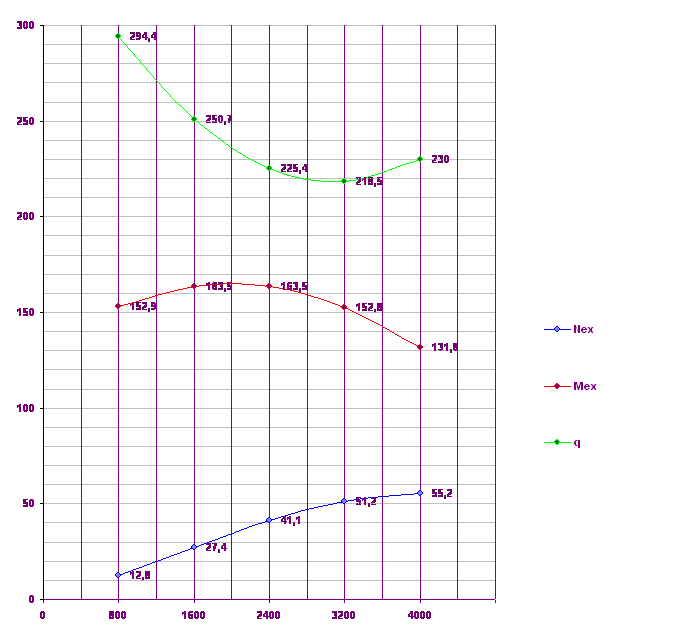 qe1 = 230 * [1,55 - 1,55 * 800 / 4000 + (800 /4000)2 ] = 294,4 (г/кВт*ч)
