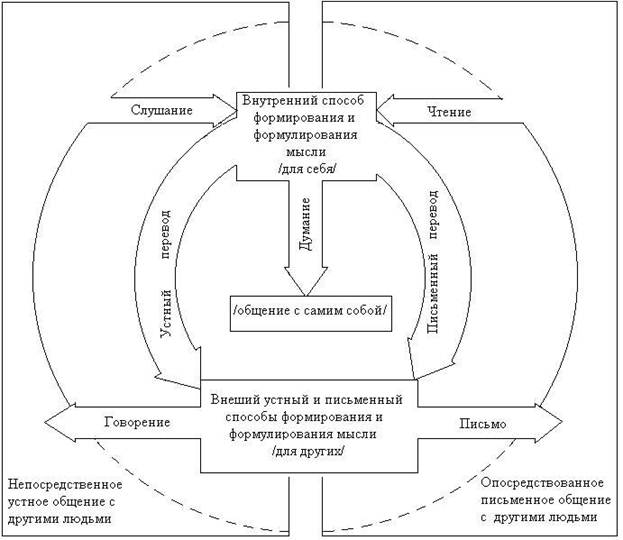 Схематическое изображение взаимосвязи видов РД, форм речи в системе «говорящего человека» в различных формах (устной и письменной) общения.