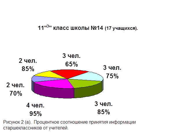 Желание выслушать мнение, точку зрения, интересную и ценную информацию от друзей вне школы, родителей, учителей, одноклассников по предпочтениям были расположены по следующим местам: на первом месте – друзья вне школы, на втором – родители, на третьем – учителя, а на четвертом – одноклассники. Для наглядности мы представили на диаграммах 4 и 5 процентное соотношение принятия информации старшеклассников от своих учителей.
